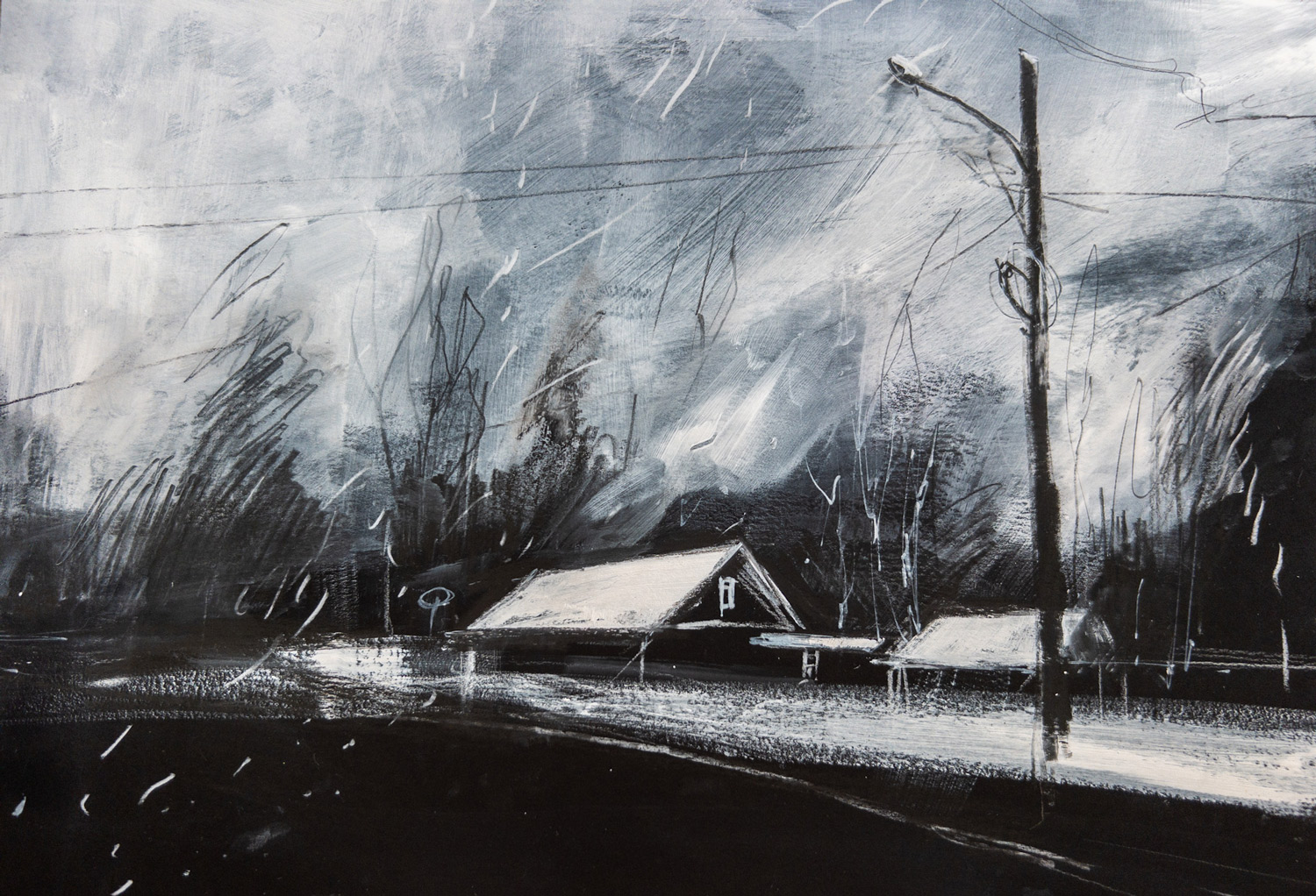 - Снег и домик на черной бумаге.